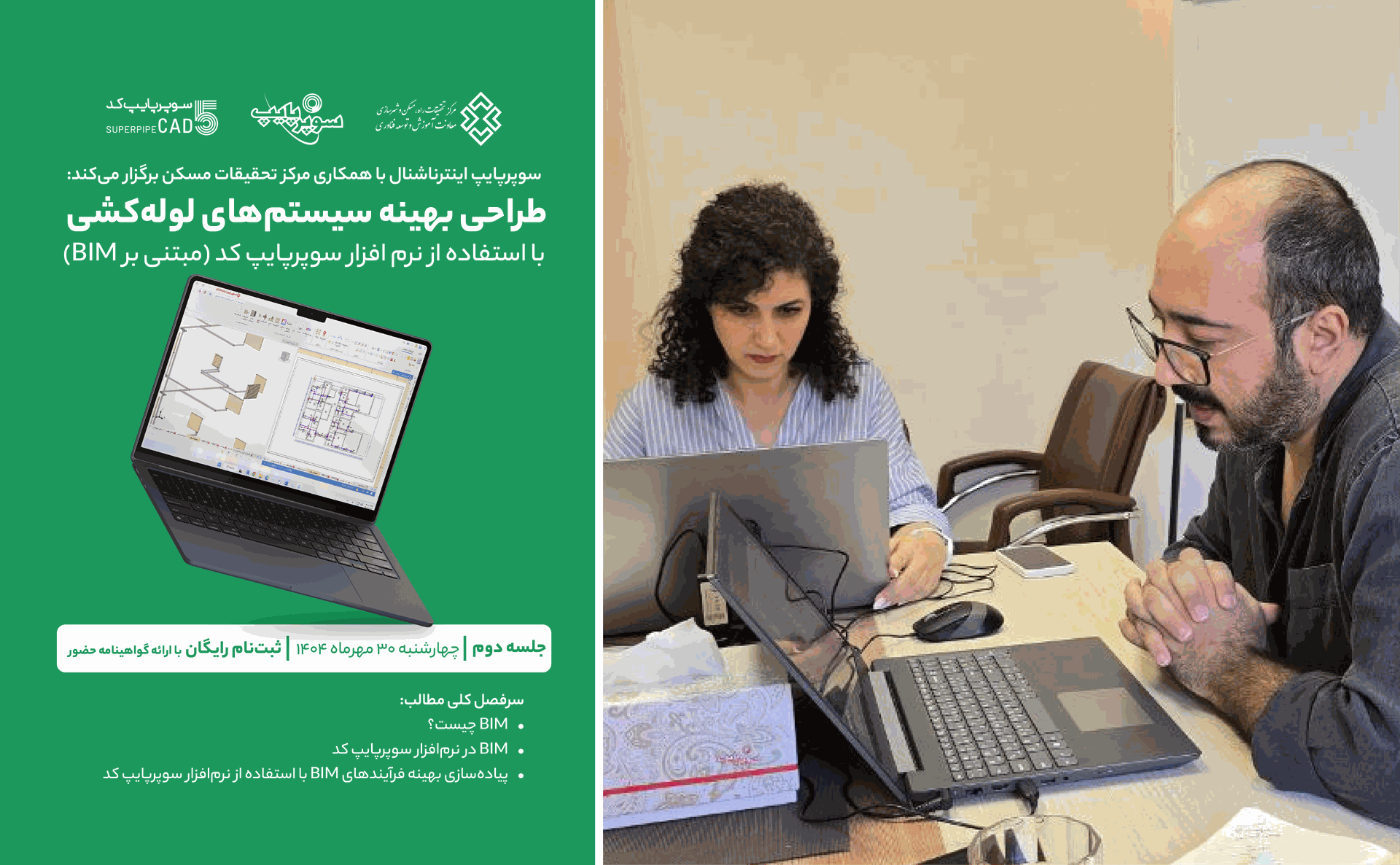سرفصلهای آموزشی این وبینار شامل آشنایی با BIM، کاربرد BIM در نرمافزار سوپرپایپ کد و پیادهسازی بهینه فرآیندهای BIM با استفاده از این نرمافزار بود.